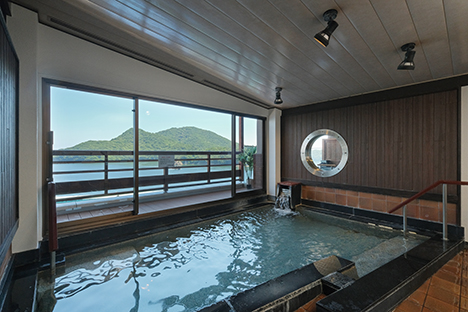 눈 앞에 펼쳐진 세토나이카이, 토모의 잔잔한 해면을 바라보며 탕에 몸을 담그고 몸과 마음을 다스린다.